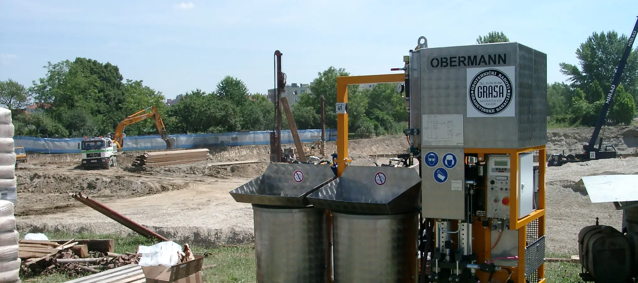The VS 63-20-F/E unit is a manually operated, versatile slurry, mixing and injection plant with stainless steel containers, water storage and dosage tank, two-plunger pump and diesel drive. Developed for anchor injections, rock and base grouting, cavity filling, flush drilling, grouting work, tunnel construction and sealing injections.